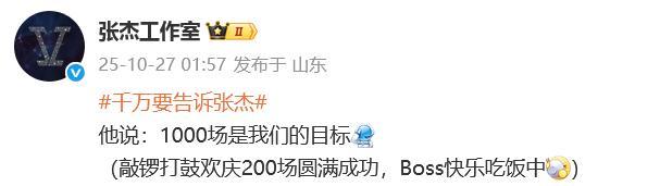 张杰工作室在27日凌晨发文回应200场演唱会圆满成功,并表示1000场是他们的目标。