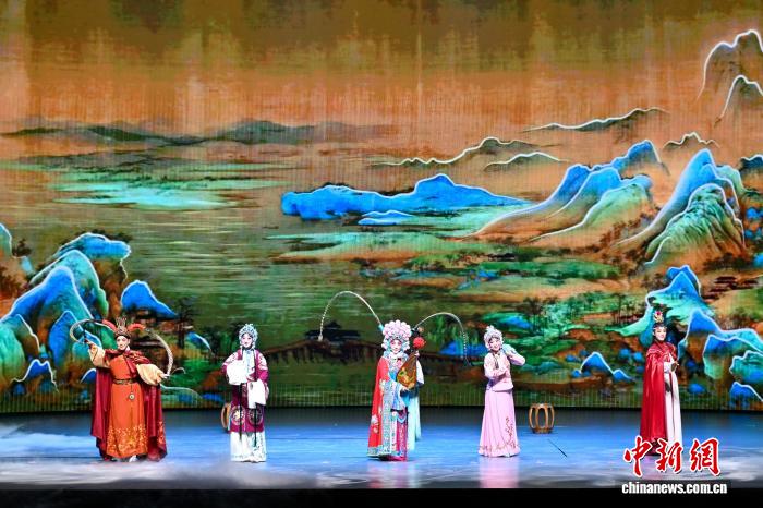 11月4日晚,第十四届中国艺术节闭幕式在重庆举行。作为中国规格最高、最具影响力的综合性文化艺术活动,本届艺术节以“艺动巴山蜀水 共绘时代新篇”为主题,由中国文化和旅游部、重庆市人民政府、四川省人民政府共同主办。本届中国艺术节汇聚数百家全国专业文艺院团和群众文艺团队,集中展演舞台艺术精品100余台、群众文艺作品170余个,展出美术、书法篆刻、摄影作品1100余件,全面展现新时代艺术创作的繁荣面貌。图为演员们在第十四届中国艺术节闭幕式中表演戏曲联唱。中新社记者 何蓬磊 摄