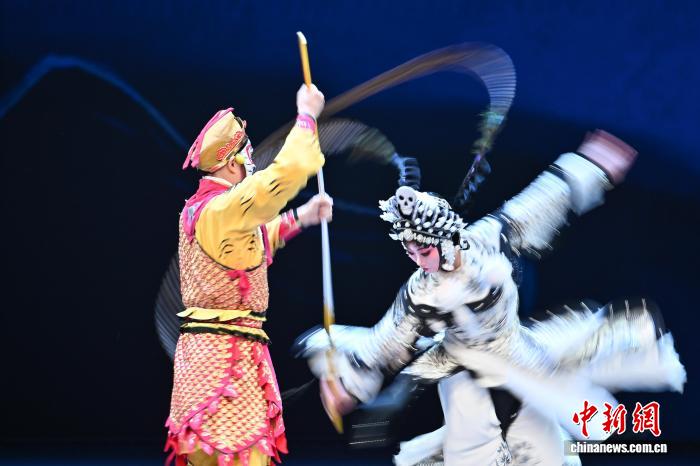 11月4日晚,第十四届中国艺术节闭幕式在重庆举行。作为中国规格最高、最具影响力的综合性文化艺术活动,本届艺术节以“艺动巴山蜀水 共绘时代新篇”为主题,由中国文化和旅游部、重庆市人民政府、四川省人民政府共同主办。本届中国艺术节汇聚数百家全国专业文艺院团和群众文艺团队,集中展演舞台艺术精品100余台、群众文艺作品170余个,展出美术、书法篆刻、摄影作品1100余件,全面展现新时代艺术创作的繁荣面貌。图为演员们在第十四届中国艺术节闭幕式中表演婺剧《三打白骨精》。中新社记者 何蓬磊 摄