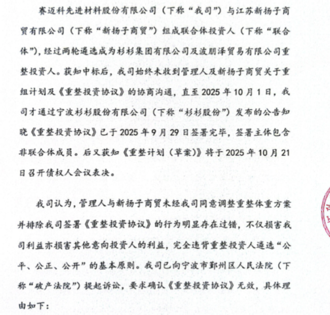 此前10月15日,赛迈科向宁波市鄞州区法院提起诉讼,称虽然公司所在的投标联合体成功中标,但赛迈科的重整投资者资格却被TCL产投替换,公司对新重整协议的签署并不知情,要求鄞州区人民法院判决该重整计划无效。