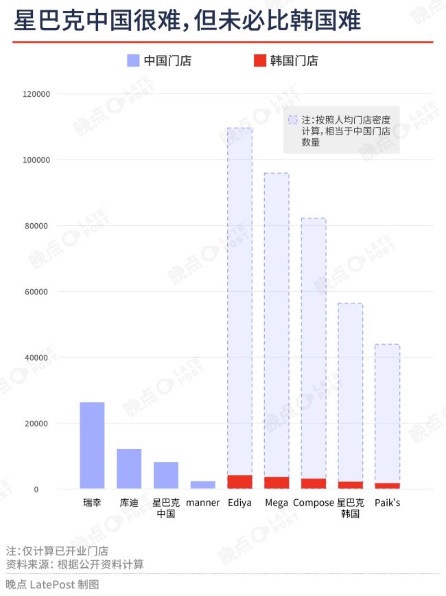 在5100万人口的韩国,星巴克开了2050间店。如果不考虑收入水平,只看人口总数,星巴克中国要开到5.6万家,超过蜜雪冰城,才能达到星巴克在韩国的门店密度。