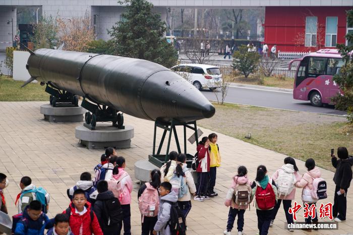 11月5日,黑龙江哈尔滨,学生在哈工大航天馆室外展区参观东风二号弹道导弹(实物)。中新社记者 赵宇航 摄