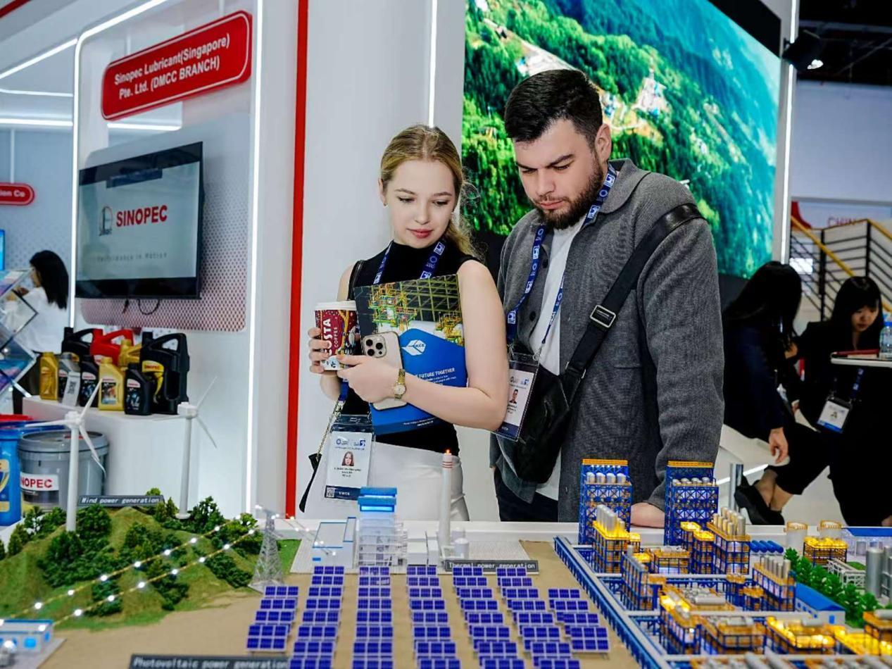 展会期间,中国石化展出的绿电制氢项目沙盘受到与会人士高度关注。据介绍,该模型展示了太阳能发电、风能发电、电力输送、绿氢工厂、氢气储存和输送、绿氢交通、绿氢炼化、地热能供暖(制冷)等综合应用场景,生动呈现了中国石化在可再生能源制氢成本降低和规模增长方面的成果,