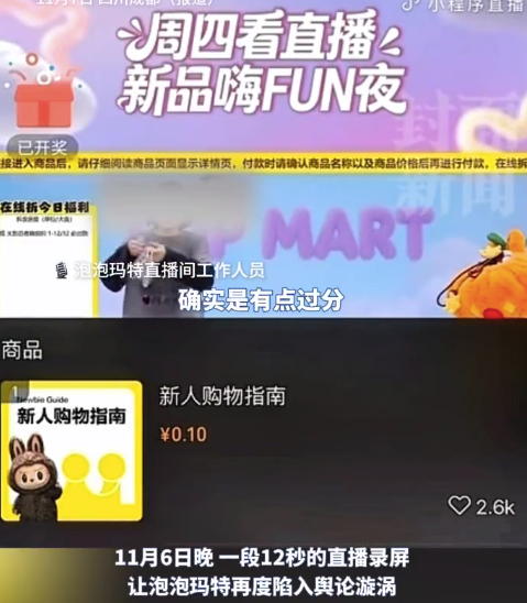 11月6日晚,泡泡玛特一段12秒的直播录屏在网络流传。视频显示,当晚23:35,泡泡玛特泡泡抽盒机小程序直播间内,直播结束后,画面未及时切断,一名女工作人员手持品牌挂链直言“妈呀,这东西卖79元确实是有点过分了”,身旁男同事则回应“没事,会有人买单的”。