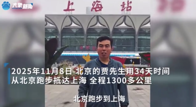 2025年11月8日,来自北京的跑步爱好者贾先生发视频称,自己用34天时间从北京跑步抵达上海,全程1300多公里。