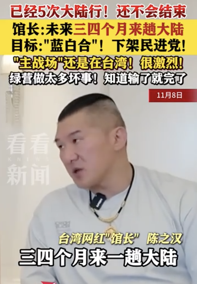台湾网红“馆长”陈之汉从第五次大陆行归来后,11月8日接受媒体专访。他表示自己“未来三四个月来一趟大陆,‘主战场’还是在台湾。”并称自己的主要目标是“蓝白合”和下架民进党。