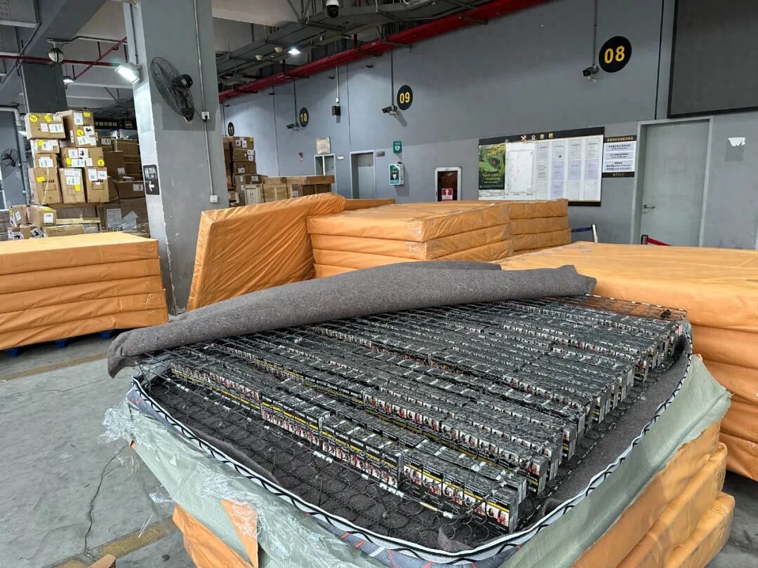 海关关员在对一批以一般贸易方式申报出口的“床垫”进行查验时,发现该批床垫机检图像异常,图像显示该批床垫内部有整齐排列的矩形物体,疑似有夹藏物品,随即扩大查验范围。在割开其中一个床垫外层棉布后,关员发现在床垫内部的弹簧夹层中藏有大量香烟。经清点,共查获香烟4796条,合计95.92万支。