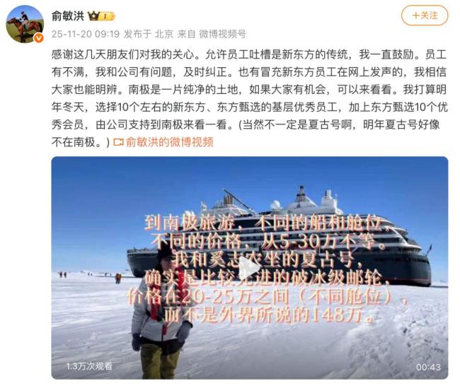 此前,俞敏洪因在南极发公司内部信并在在社交平台发布多条南极游视频引发争议。他在社交平台发布的视频中表示,前几天信号不好,视频是四天前制作的。据透露,他乘坐的是名为“夏古号”的邮轮,这艘邮轮具备PC2级破冰能力,能够抵达地理北极点及南极威德尔海等极端区域。该邮轮提供多种航线,包括13天12晚和29天28晚的不同行程,价格从约26万元到148万元不等。