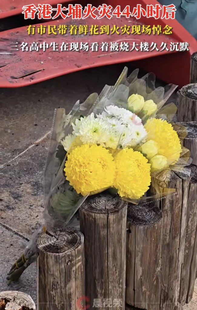 香港市民带着鲜花到大火现场悼念。香港大埔宏福苑火灾造成重大人员伤亡。香港大埔火灾44小时后,有市民带着鲜花到现场悼念,三名高中生看着被烧大楼久久沉默!