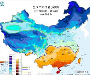 受寒潮影响,预计,12月2日8时至12月4日8时,黑龙江东南部、吉林东部、黄淮、江淮、江南中东部、华南东北部等地将出现大风降温,上述地区气温普遍下降6~8℃,其中,江苏、安徽大部、浙江中北部等地部分地区气温将下降8~10℃,局地降温可达10℃以上。12月4日早晨,最低温度0℃线将南压至浙江中南部、安徽南部、湖北北部一带。