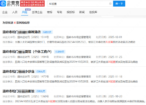 近期,多家餐饮店因被浙江外卖在线AI巡查抓拍到老鼠活动痕迹被行政处罚,涉事门店被责令改正并处罚款500元。