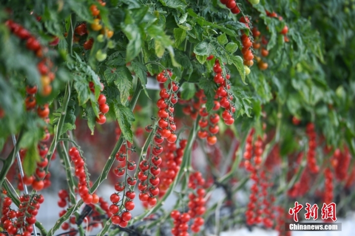 图为寿光市的蔬菜大棚里,西红柿自动化生产,果实娇艳。
