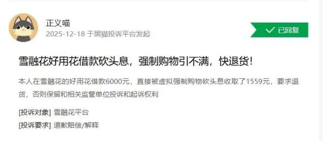 收取“砍头息”、强制购物,是用户在第三方投诉平台上对雪融花的主要指控。去年12月18日,在黑猫投诉平台上,有用户投诉称,其在雪融花旗下的“好用花”借款6000元,被以虚拟强制购物的形式直接扣除1559元作为“砍头息”,并要求退货。