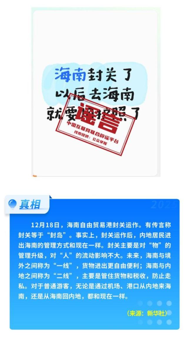 这些谣言别再传了 多部门联动辟谣护清朗!海南自由贸易港封关并不等于“封岛”,而是一些人对政策的误解。同样,“一次性信用修复”有严格的适用范围,并非所谓的“信用洗白”。关于12306购票取消靠窗选座的消息,实际上是购票界面进行了优化调整。