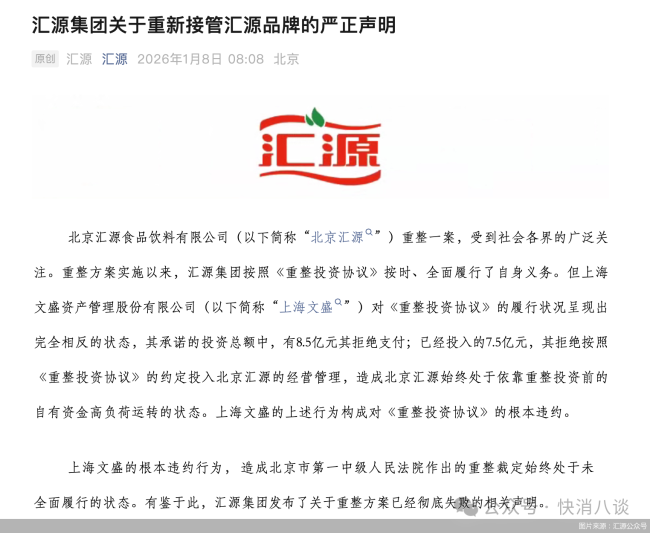 这是汇源半年以来,第四次发布声明。2025年8月9日,北京汇源发布《致全体股东及转股债权人的公开信》,公开披露文盛资产重整资金未到位,其承诺的投资总额中尚有8.5亿元已逾期一年以上,且经北京汇源11次催缴仍未实缴;8月24日,北京汇源再次发布声明称,公司公章及营业执照正、副本均由专人负责保管,全程处于安全、有效管控状态,从未发生遗失、失控或交由他人保管的情况;12月19日,汇源集团发布严正声明称,指出上海文盛未履行《重整投资协议》约定的投资承诺;直到这次,汇源集团时隔20天再发声明。