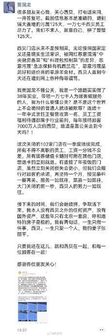 有西贝闭店员工称关闭是因租金到期 网络污蔑引发大规模闭店!西贝董事长贾国龙在朋友圈正式回应了大规模闭店事件,确认将在一季度关闭全国102家门店,占总数的30%。他将经营危机归咎于持续125天的“网络污蔑”,这一事件引发了公众对餐饮业危机管理、预制菜争议及企业责任的多维度讨论。