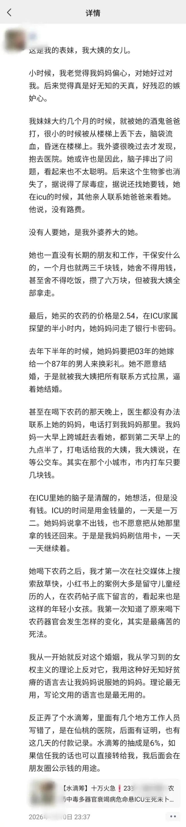 求助文中附有一个水滴筹众筹项目的链接,向社会公众求助,为这名喝农药中毒导致多器官衰竭的年轻女子募集医疗费用。筹款项目显示,女子喝农药轻生的时间为1月7日晚上。水滴筹公关方面工作人员确认了当事人中毒情况和筹款项目的真实性。