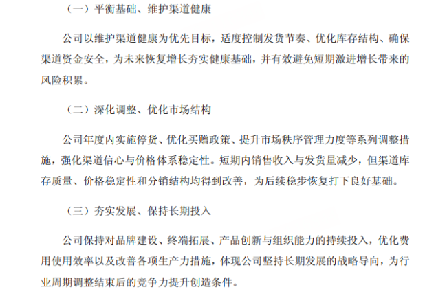 在此背景下,水井坊称,公司围绕外部环境变化,重点从维护渠道健康、优化市场结构和保持长期投入三方面进行调整。