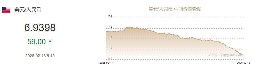 中新网2月13日电 据中国外汇交易中心网站消息,中国人民银行授权中国外汇交易中心公布,2026年2月13日银行间外汇市场人民币汇率中间价为:1美元对人民币6.9398元,上调59个基点。
