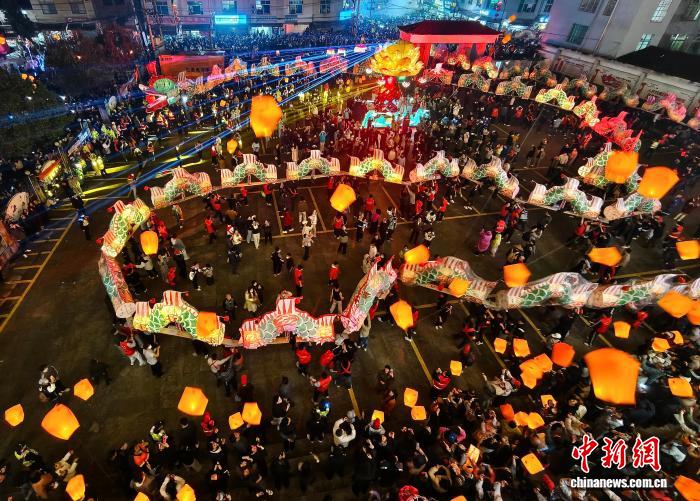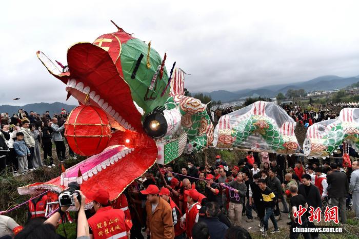 188节拼接而成、总长超千米的巨型祥龙昂首腾跃,数万民众追龙祈福、共庆元宵,一场气势恢宏的民俗盛宴在古镇的街巷田野间热烈上演。中新网记者 张斌 摄