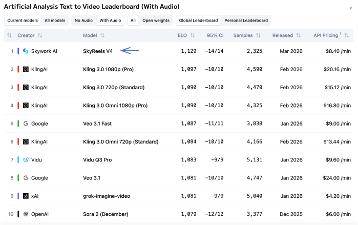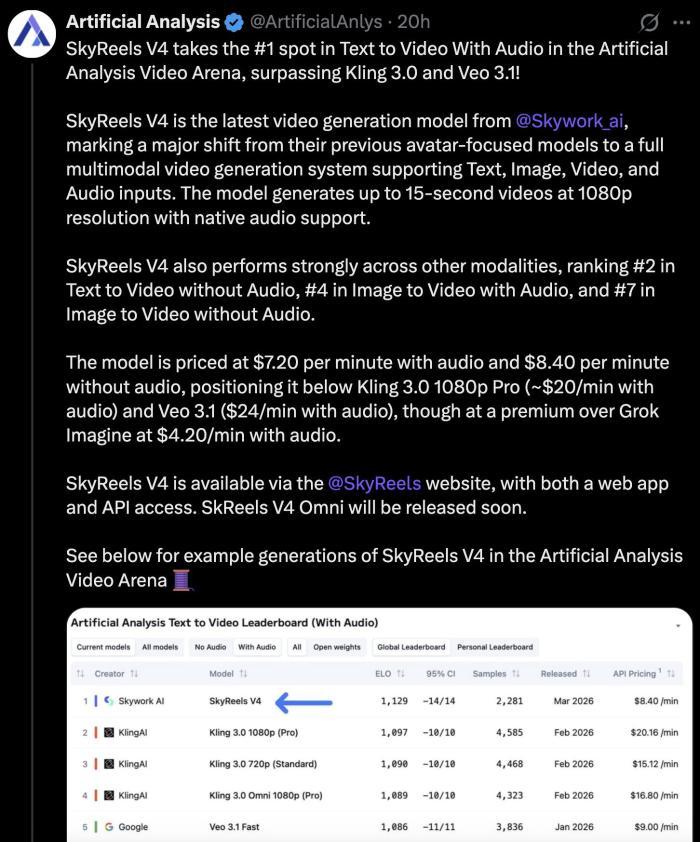3月19日,天工AI大模型SkyReels V4登上Artificial Analysis榜单Text to Video(With Audio)赛道全球第一,显著超越Kling3.0、Google Veo3.1、Vidu Q3、OpenAI Sora2等全球主流模型,成为全球AI视频生成能力最强的大模型,标志中国AI视频生成技术实现世界级引领。