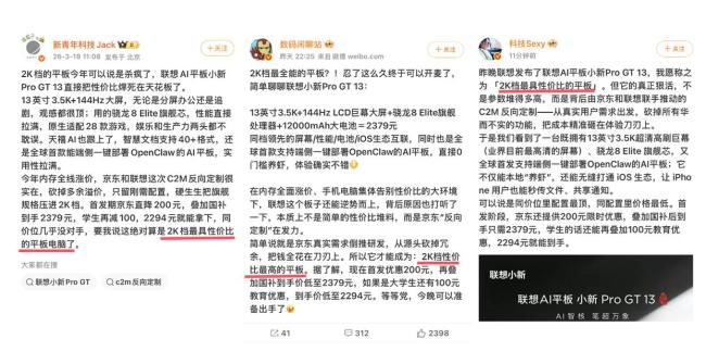 小新ProGT13被称2K档性价比王。3月18日19点,联想在春季新品发布会上推出了多款平板新品,包括联想AI平板小新Pro 13、小新Pro GT 13和拯救者Y700五代。其中,小新Pro GT 13是京东与联想联合打造的C2M反向定制产品,8+256GB版首发价2799元,叠加国家补贴后到手价2379元起,学生用户还可额外享受100元专属优惠,到手价低至2294元起,以旧换新至高可补贴1200元,大幅降低入手门槛。这款平板凭借旗舰级性能、创新AI能力与沉浸式影音体验,被多名数码博主称为“2K价位段最具性价比的平板”。目前,该产品已在京东全面开售。