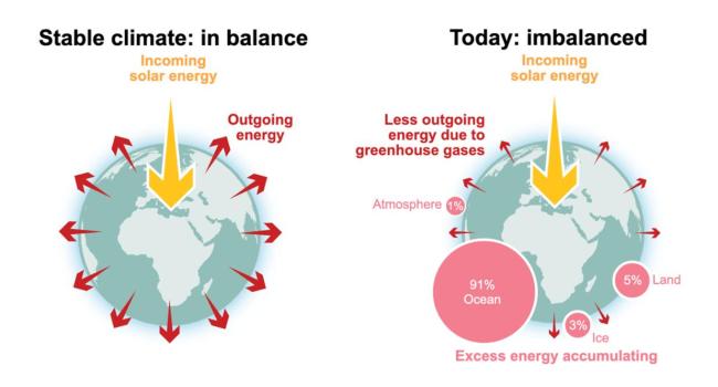 报告首次将地球能量失衡列为关键气候指标之一。留存地球的过剩能量中,仅1%储存在大气层,造成大气层变暖;大约5%的过剩能量储存在大陆陆地中;超过91%的过剩热量储存在海洋中。2025年,海洋热含量达到历史新高,其升温速度比1960年至2005年翻了一番还多。过去二十年来,海洋每年吸收的能量大约是人类年能源消耗量的18倍。海洋温度的升高对海洋生态环境和全球天气系统带来了一系列负面后果和连锁反应。另有3%的过剩能量导致冰川升温融化,南极洲和格陵兰岛的冰盖均损失了大量质量。