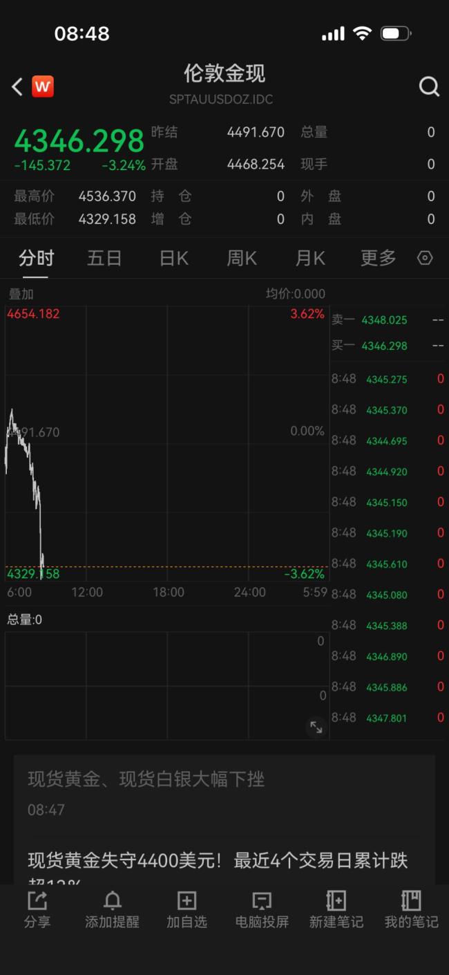 3月23日早盘,贵金属价格大幅下跌,黄金和白银跌幅均超过3%。截至早上8:48,伦敦现货黄金下跌3.24%,暂报4346美元/盎司附近;现货白银下跌3.59%,暂报65.462美元/盎司。